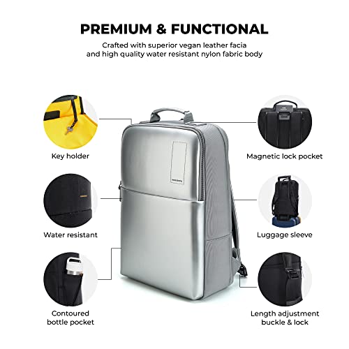 MOST FEATURE RICH BACKPACK: Vegan leather trims, Padded shoulder straps, Easy length adjustment buckle & strap lock, Hidden expandable side water bottle pocket, Hidden magnetic passport pocket, Luggage sleeve