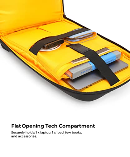 MOST FEATURE RICH BACKPACK: Front bucket pocket: Retractable key holder, Card holder, Slip pockets, Zippered pocket, Flat opening tech compartment: 5 pockets to store all your tech accessories, Padded laptop compartment with lock strap, Fits up to a 16” laptop