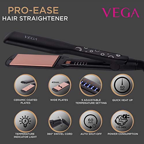 Vega Pro-Ease Hair Straightener is perfect for quick styling with great ease. The Straightener comes with ceramic coated plates which allow even distribution of heat and protect hair from heat damage. The wide plates easily glide through larger section of hair and are highly suitable for long and thick hair. The 5 temperature settings from 150?C to 230?C allow you to set the temperature according to your hair type. Style almost instantly as the straightener heats up in 60 seconds. If you forget to switch off, the straightener automatically shuts off after 60 minutes with the auto shut off feature. The 360 swivel cord rotates conveniently and prevents unnecessary tangles.