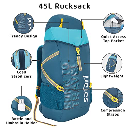 Escape 45L is a unique offering from Safari’s rucksack ranges. This bag is perfect to meet ALL your travel needs – Trekking, Camping, Work, Adventure or Leisure! Made out of water-resistant fabric & front panel design, it serves as a highly elegant look. Spacious compartments give you enough storage capacity for 4-5 days travel with clothes and other essential accessories. Escape is provided with compression straps which restrict the movement of items inside the bag and breathable back mesh that prevents the back of the bag from overheating. The load stabilizers provided on the top of the shoulder straps make your long hauls less tiresome by reducing load on shoulders. Go ahead and add this super stylish and comfy rucksack to your travel collection, whether it be for an adventure vacation or a business trip.