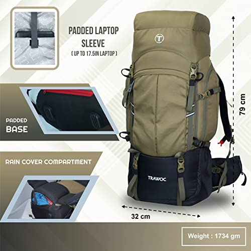 Spacious and Multiple compartments : This large capacity trekking bag has spacious main compartment, numerous small compartments and pockets. Main compartment has both zipper and drawstring closing design. A padded laptop sleeve is provided which can fit a laptop up to size 16.5 inches. The padded hip belt with pocket offers convenience and extra storage for wallets, mobile phone etc.