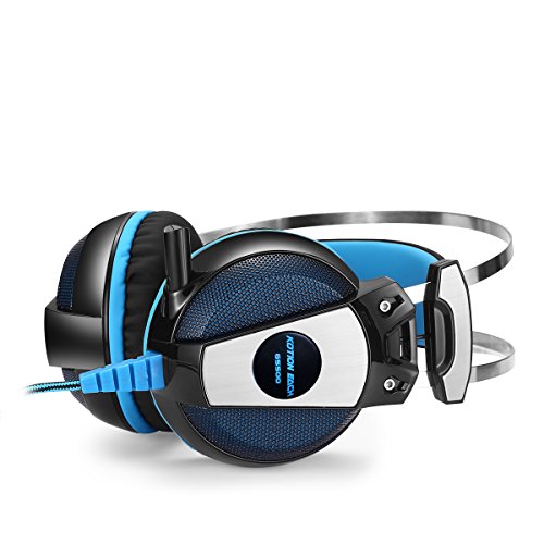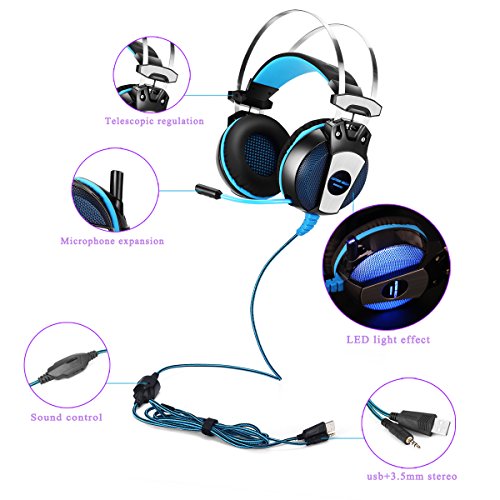 Driver diameter: 50mm Impedance: 32ohm Sensitivity: 108dB plus /- 3dB at 1KHz Frequency range: 15Hz-20KHz Mic dimension: 6.0 x 2.7mm Mic sensitivity: -38dB plus /- 3dB Mic impedance: 2.2kohm Directivity: Omnidirectional LED working voltage: DC5V plus /- 5 percent Operating current: Below 100mA Headset interface: USB (plug the USB connector, LED light is on, unplug, it off) plus 3.5mm stereo Cable length: Approx. 2.1m / 6.89ft Headphone color: Black and blue Headphone size: Approx.19cm x 10.5 x 22.5cm / 7.5 x 4.1 x 8.9in Headphone weight: 447g / 15.8oz Package size: 22 x 11.8 x 23.5cm / 8.7 x 4.6 x 9.3in Package weight: 610g / 1.34Lbs.