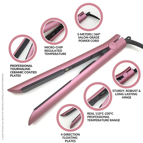 Alan Truman Black AT-107 Metallic Pink Styler is one of the affordable offerings by Alan Truman. It has premium black tourmaline ceramic plates. Comes with 1-inch rounded edges plate for convenient curling and straightening. Manual temperature dial for easy selection and control with 110°C to 230°C variable wide temperature range. Compact and sleek shape and form. Safe and secure to handle with 60 minutes auto-shutoff. Continuous temperature monitoring and regulation which prevents hair damage due to excessive heat exposure. Plates mounted on a 6-direction floating mechanism. Comes with temperature readiness indicator LED. Packed in hardboard box for easy storage and gifting with a velvet storage pouch for travel and storage. Alan Truman brings to you innovative, high-performance hair styling products and accessories. With an extensive product range, Alan Truman has been successfully catering to professional hairstylists all across the globe with its exceptional quality salon care products and hair styling tools. All the products are designed with cutting-edge technology to bring you complete style, control and flexibility.